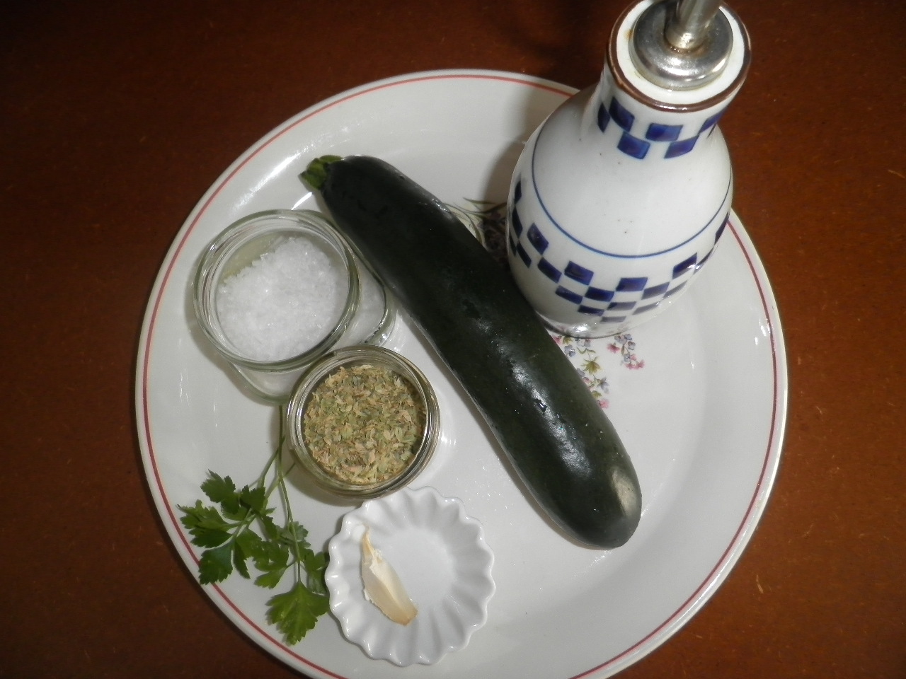 Disponer el calabacín en un plato, espolvorear con el orégano, regar con el a.o.v.e y añadirle la sal y la pimienta.