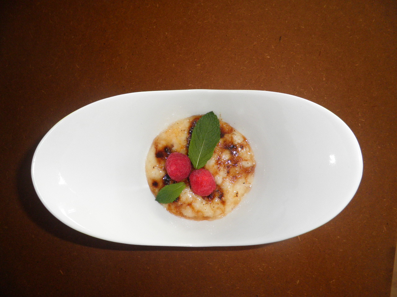 Poner el arroz con leche en los recipientes donde los vayamos a servir. echar por encima el azúcar y con ayuda del soplete o de un quemador caliente, caramelizar el arroz con leche.Dejar en la nevera que esté frío.A la hora de llevar a la mesa decorar con unas frambuesas y unas hojas de menta.