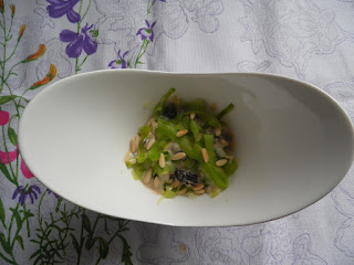 Colocar los calabaghettis en el plato de servicio verter la salsa por encima, remover con cuidado y decorar con los piñones.