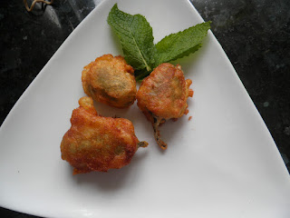 Pasamos los chiles por harina, procurando que cojan muy poca, y luego los bañamos en a tempura y los freímos en aceite caliente.