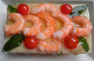 He preparado 2, uno grande y otro más pequeño. El pequeño lo he hecho partiendo a la mitad las rebanadas de pan, pero los ingredientes son los mismos, bueno un poco más escaso de langostinos.