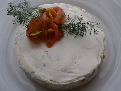preciso. Mezclamos la vodka con el agua y con esto “regamos el pan”. Picamos el salmón y se lo añadimos al queso