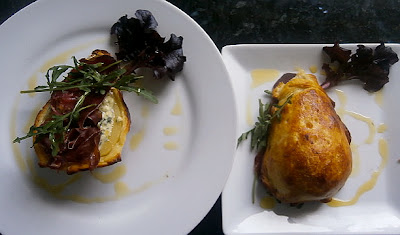 queso azul, encima don lonchas finas de cecina de León y unas hojas de rúcula.