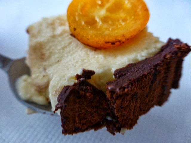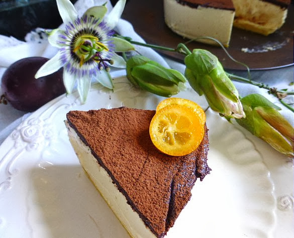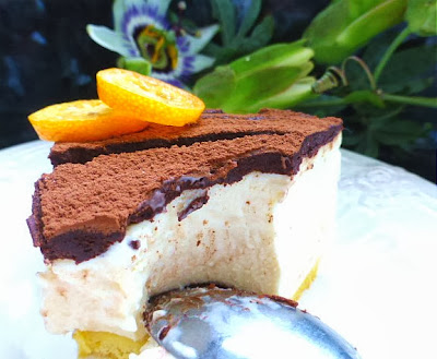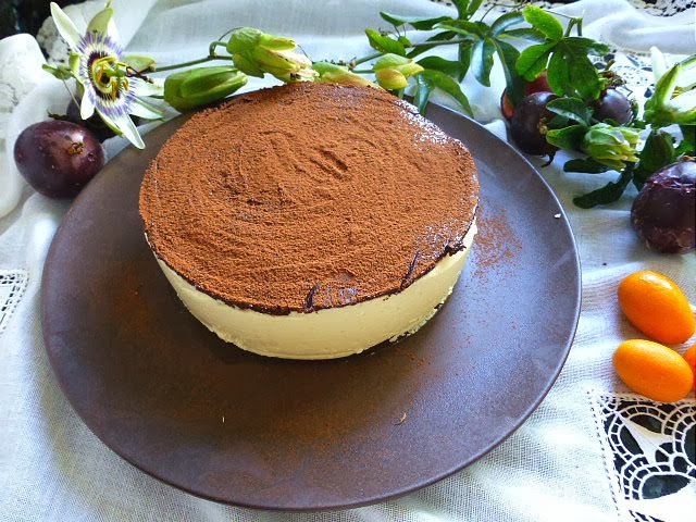 Vertemos la preparación de chocolate por encima de nuestra mousse y llevamos al frigorífico para que acabe de enfriarse. A la hora de servir espolvoreamos con cacao puro por encima... que haga el efecto de terciopelo.