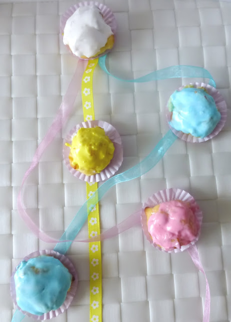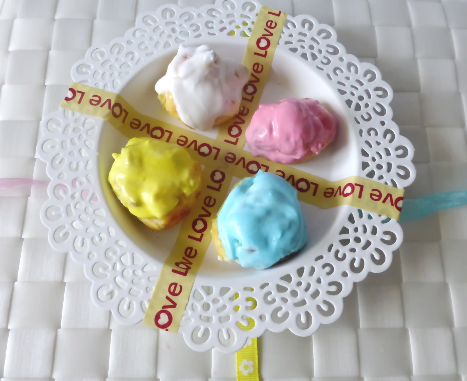 Pintamos nuestros bocaditos con la glasa de colores y…  Ya está.