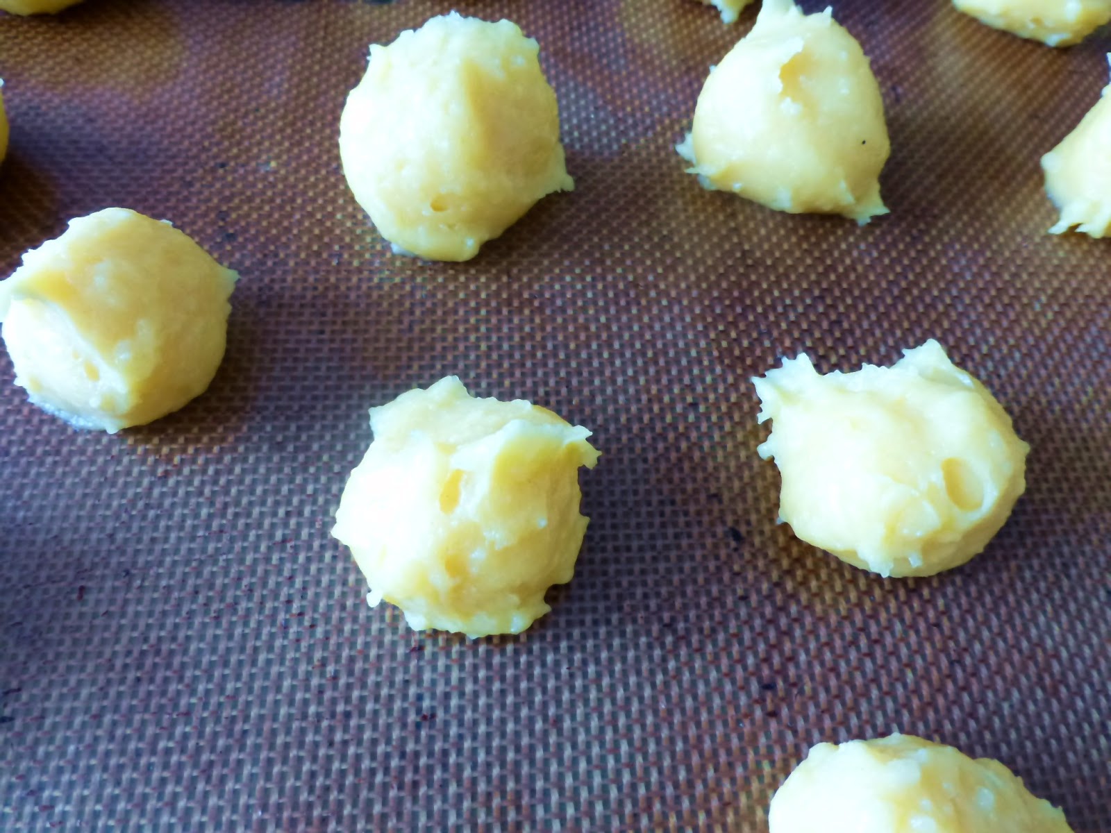 Con ayuda de dos cucharillas hacemos bolitas con la masa y las vamos colocando encima del silpat.  Metemos al horno y cocemos unos 15 minutos.