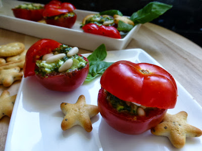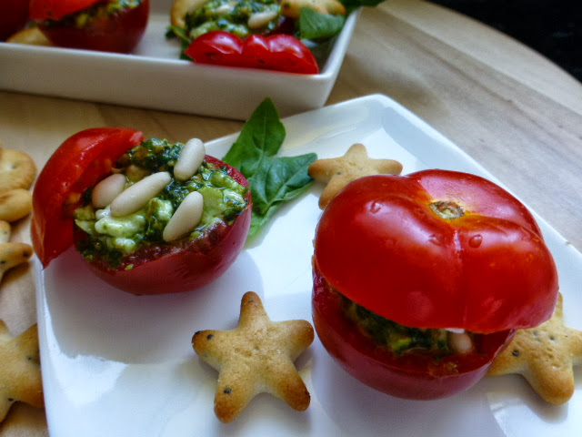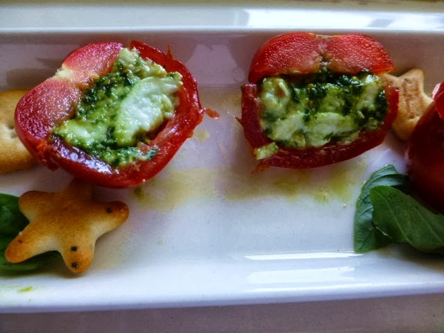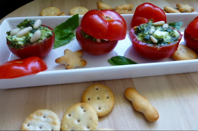 Mezclamos en un bol el queso y la salsa pesto y con esta mezcla rellenamos nuestros tomatitos, le ponemos unos piñones para adornar y unas hojas de albahaca.