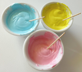 Dividimos la glasa en tantas partes como colores vayamos a hacer (en este caso 3) y los teñimos con los colorantes en gel, con ayuda de un palillo, mejor empezar de poquito a poquito para no pasarnos con el color.