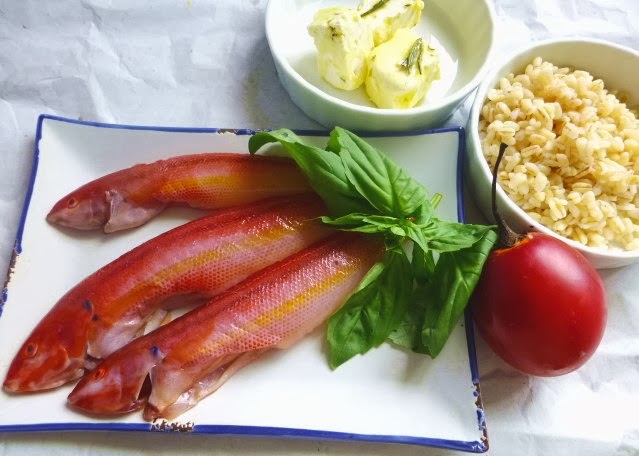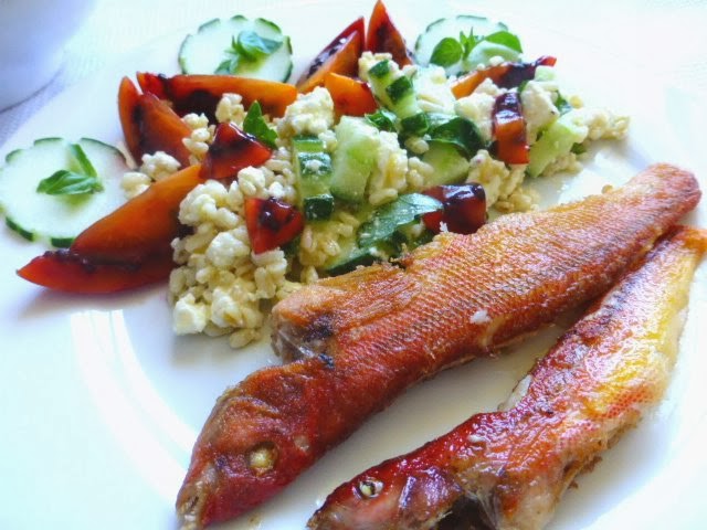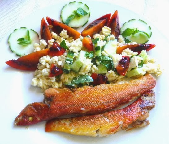 Empezamos preparando la ensalada, para ello cocemos el trigo tierno (unos 15 minutos) en abundante  agua caliente con sal, cuando esté cocido lo escurrimos y lo ponemos en un bol amplio. Añadimos el queso  feta desmenuzado, el pepino cortado en rodajas y la albahaca troceada. Aliñamos nuestra ensalada únicamente con aove y removemos todo bien, bien... que los sabores se mezclen. Reservamos hasta el momento de servir.