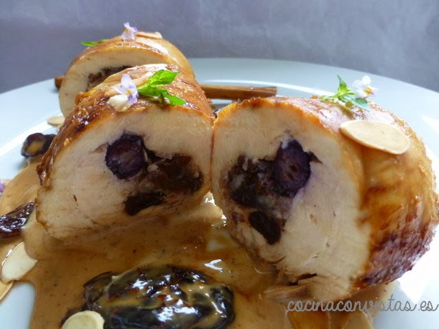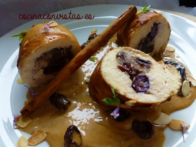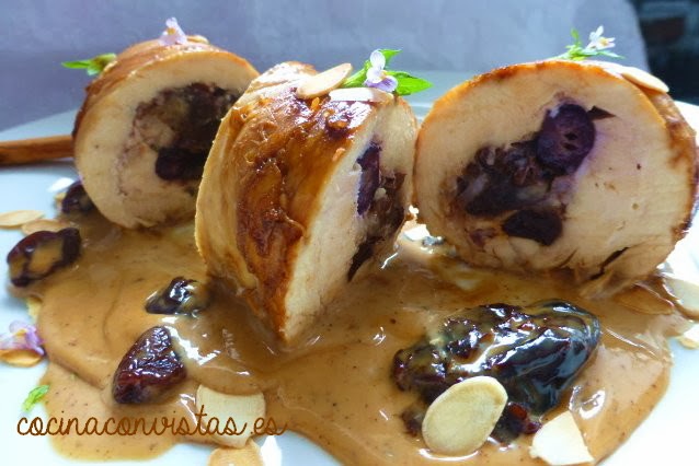 Cortamos un trozo amplio de papel film doble (de unos 25 x 40 cm) y sobre él ponemos el filete de pechuga. Le ponemos un poquito de sal y otro poquito de canela y en el centro  la mitad  de nuestras frutas rehidratadas, escurridas y cortadas (dejaremos algunas enteras  para la presentación).