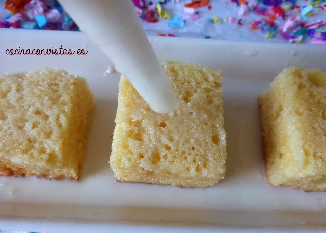 Bañamos los cubos de bica con la leche hirviendo (para que lleguen a la mesa templaditos) lo justo para que queden jugositos pero enteros (yo he utilizado una jeringa, porque lo he puesto directamente sobre el plato de servicio, pero con cuchara se podría hacer igual).