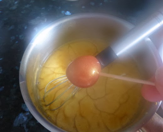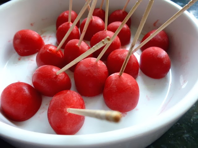 Para la siguiente operación nos ayudamos de un palillo o de una brocheta fina. Con el palillo pinchamos nuestras bolitas de helado de fresa y las sumergimos 2 ó 3 veces en el cava caliente, el contraste de frio/calor hará que se cree una fina película que guardará nuestro helado dentro. Dejamos reposar en la cuchara/plato donde vayamos a presentar nuestros suspiros de Eros. El resultado final es una finísima envoltura de cava que con la suave presión de la lengua explotará dejando salir las dulces fresas líquidas.