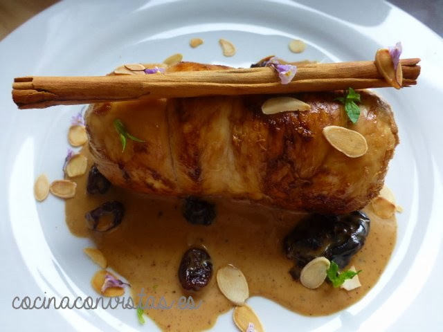 Ponemos la salsa en el fondo del plato, encima nuestro doradito pollo y decoramos con las frutas secas, la almendra laminada, el palo de canela, los brotes de menta y las flores.