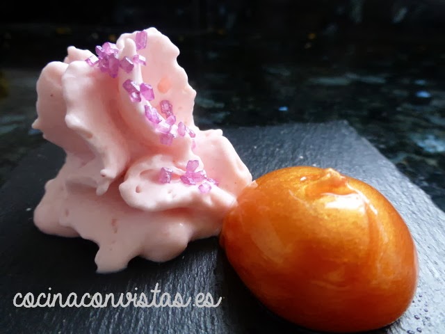 Como me sobró un poco de jugo de fresas, pensé que era el momento ideal para utilizar el sifón así que, eañadí un poquito de cava, un paquete(200ml) de nata y una carga de sifón e hice esa bonita espuma de fresas y cava.