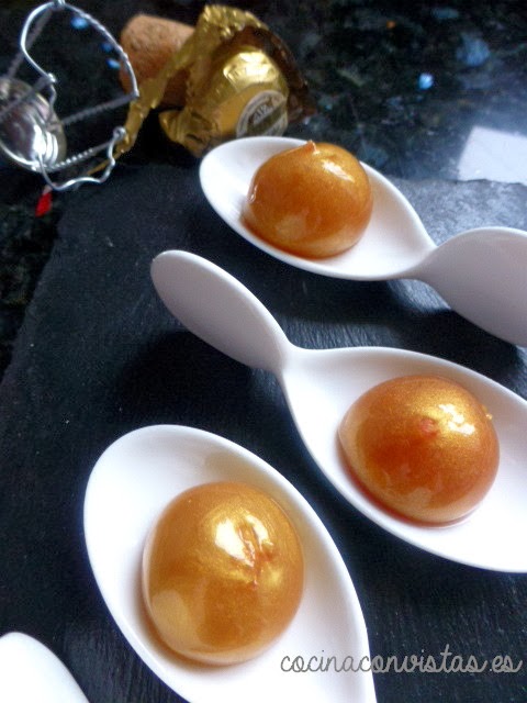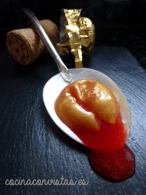 Ponemos el cava en un cazo, añadimos la gelatina vegetal en polvo y la disolvemos totalmente en el cava  con ayuda de unas varillas. Incorporamos el colorante de oro en polvo, mezclamos bien y llevamos al fuego hasta el punto de ebullición. Retiramos del fuego dejamos que baje un poquito la temperatura (hasta 80º aproximadamente).