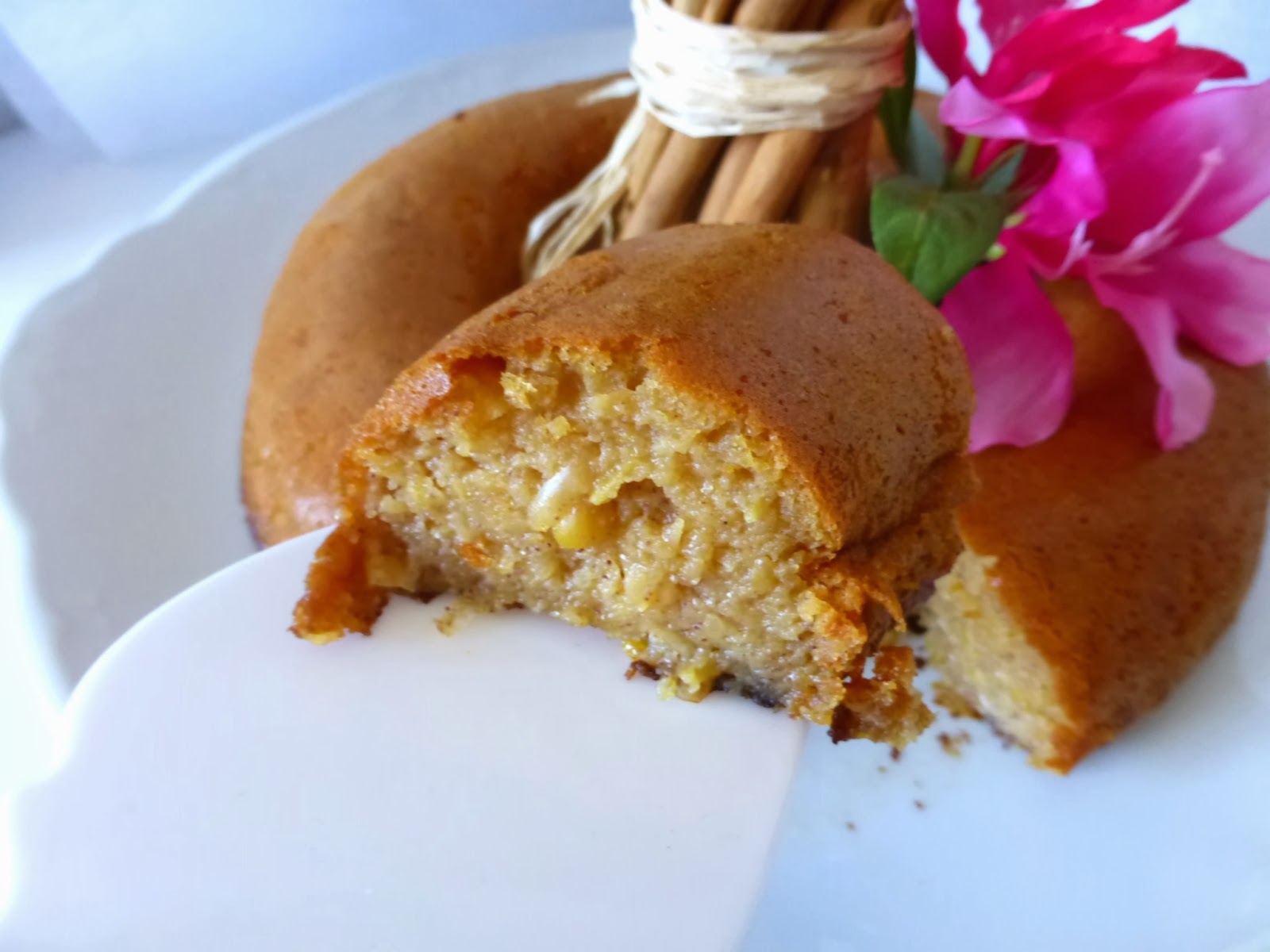 Vertemos nuestra preparación en el molde elegido, en mi caso uno de corona antiadherente, por eso no lo he untado ni de aceite ni de mantequilla y no se pegó. Cocemos durante 25 ó 30 minutos. Como sugerencia, te diré que alguna vez le he añadido una cucharada de coco rallado y no le va mal... para nada.