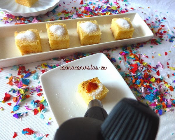Ponemos una pequeña cantidad de azúcar en cada beso (bico) y con el soplete caramelizamos al momento.