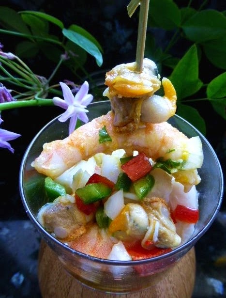 SALPICÓN DE RAPE, BERBERECHOS Y LANGOSTINOS.