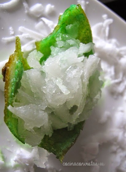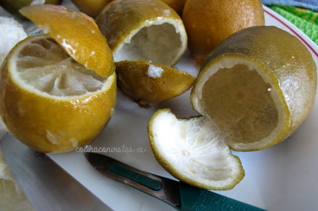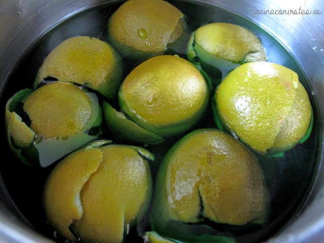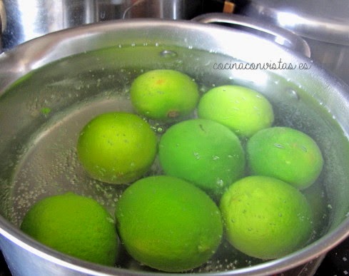 Repetimos este proceso (agua fría y cocción) tres veces más, pero sin bicarbonato, para eliminar el amargor de las limas.