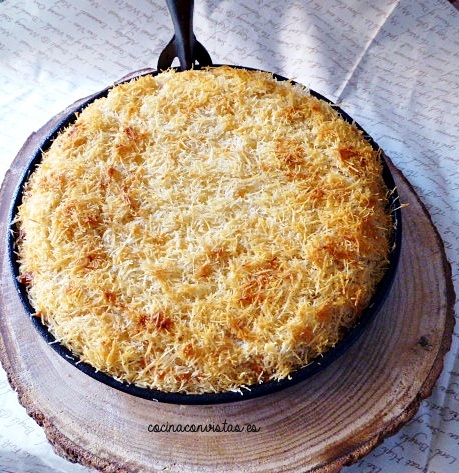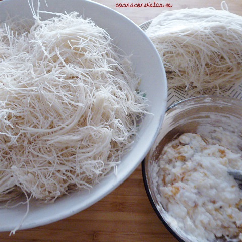 fondo y paredes de un molde bajo (o una sartén, la mía mide 22cm y la pequeña 12) con parte del Kataif (como 2/3 partes)