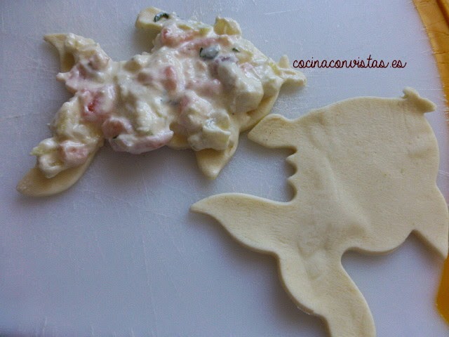 Nos quedará una tortilla plana en la que pondremos un trozo de queso y un poquito de jamón. Cerramos la tortilla y con ayuda del film transparente le damos forma como de croqueta grande o un huevo un poco más ovalado de lo normal…