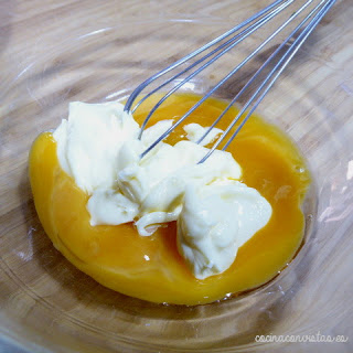 En un bol amplio mezclamos los huevos, el queso crema, la