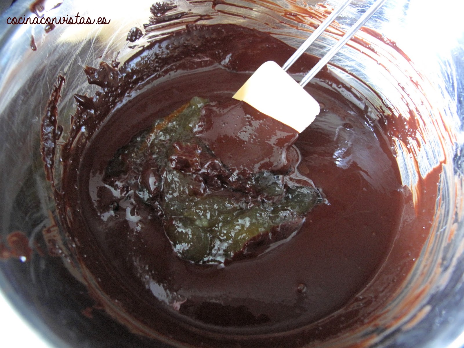 Con la batidora de varillas “montar” el líquido de cocción de los garbanzos (aquafaba) durante unos 5 minutos a velocidad baja. Se formaran picos como si fuera un merengue, ahora añadimos las gotas de limón y batimos por otro minuto más. Nuestra aquafaba montada, será muy consistente, tanto que si le damos la vuelta al bol donde está, no se caerá. Reservamos, mientras añadimos 50 grs de mermelada al chocolate, removiendo muy bien para que se integren chocolate y mermelada.