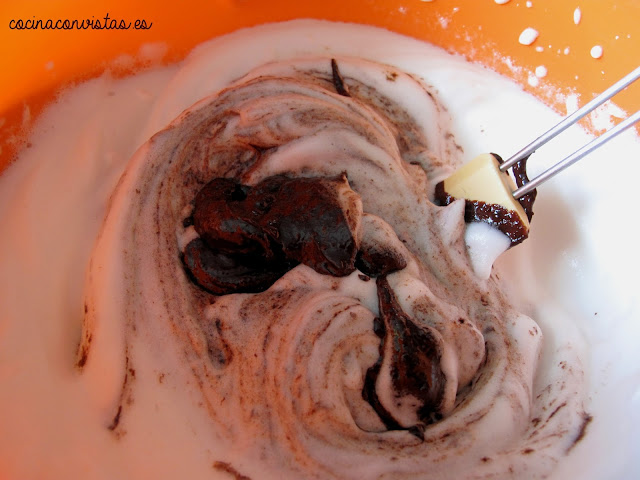 Añadimos esta mezcla de chocolate y mermelada a la aquafaba montada, con cuidado y movimientos envolventes.