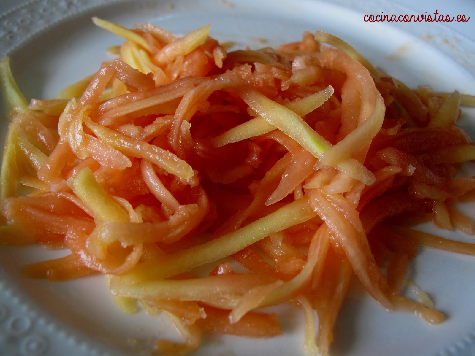 Pelar la papaya y rallarla con un rallador de agujero grueso o bien cortarla en tiritas muy finas.