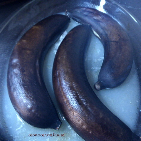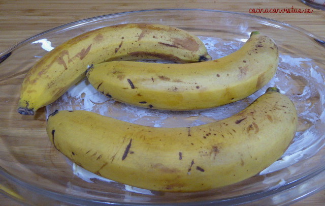 Untamos con mantequilla una fuente que pueda ir al horno, encima colocamos las bananas maduras con piel