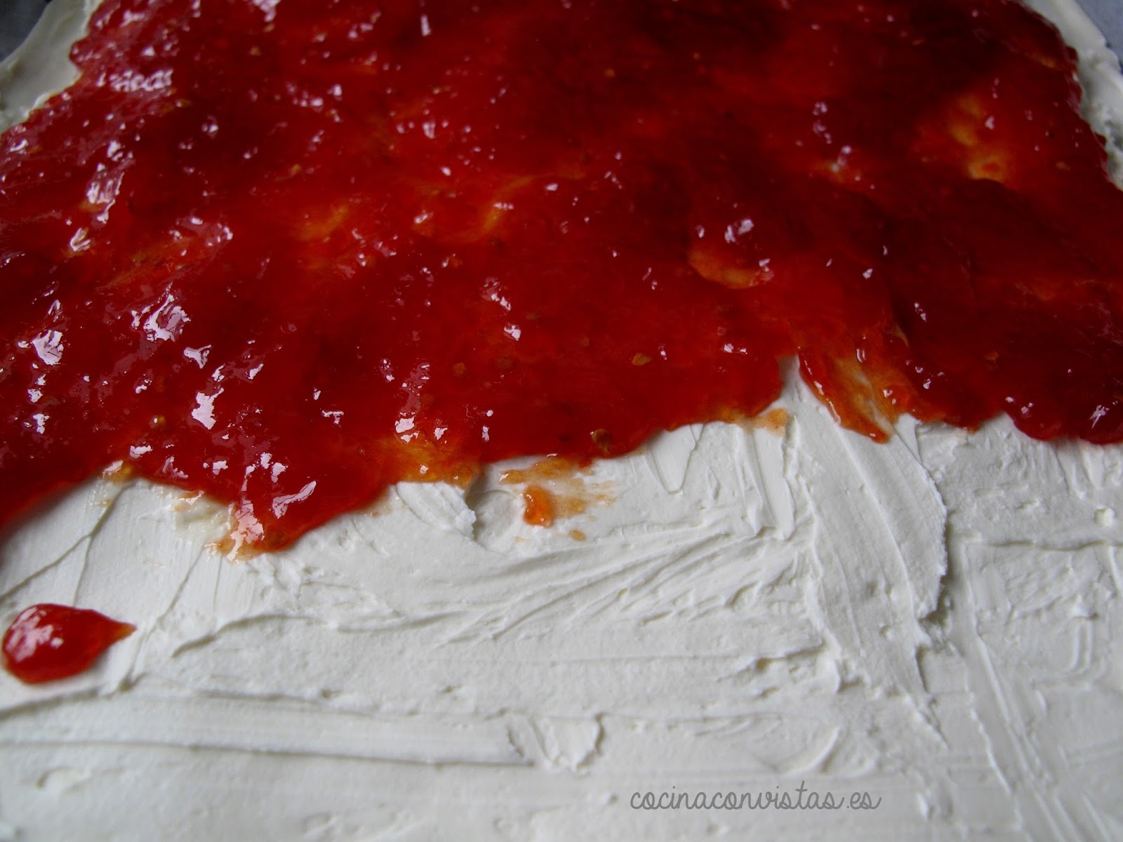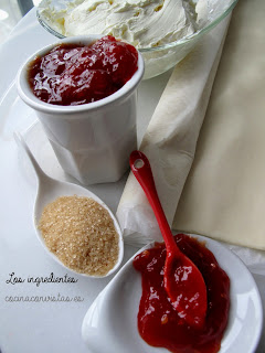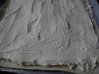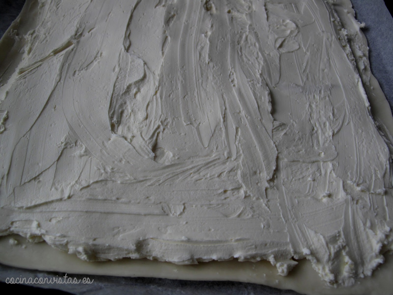 Estiramos una de las masas de hojaldre y sobre ella extendemos el queso crema,