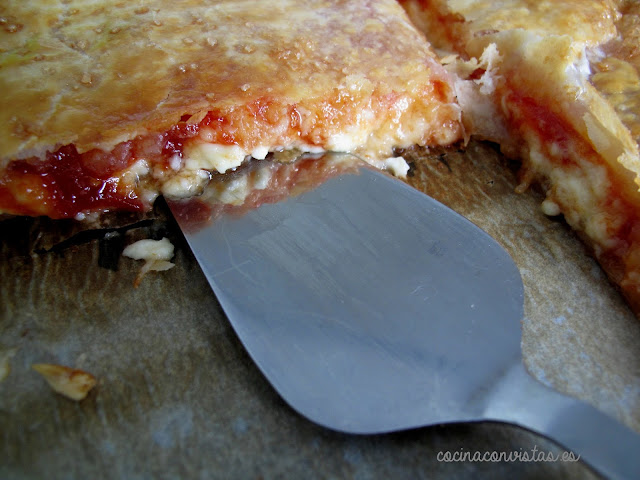 sin llegar a los bordes (para luego poder cerrar la empanada), sobre el queso ponemos una fina capa de nuestra mermelada de tomate.