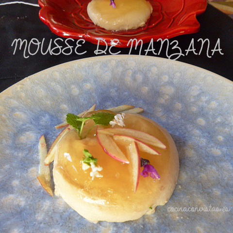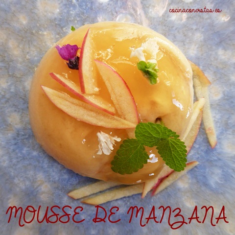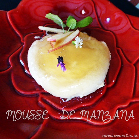 Cortar la manzana reservada en tiritas. Desmoldar los mousses y decorarlos con la manzana cortada, hojas de menta y flores comestibles.