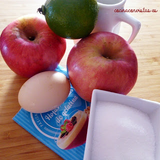 Exprimir el limón, lavar y reservar ¼ de manzana en la nevera. Pelar el resto, retirarles el corazón y trocearla. Triturar las manzanas con el zumo hasta obtener un puré homogéneo. Mezclar la nata con la mitad del azúcar (no es necesario montar).  Montar las claras con el azúcar restante  a punto de nieve firme. Poner la gelatina a remojo en agua fría (mínimo 5 minutos), escurrir bien la gelatina y diluir en ¼ parte del puré de manzana caliente (unos segundos al microondas), agregar el puré restante y remover.