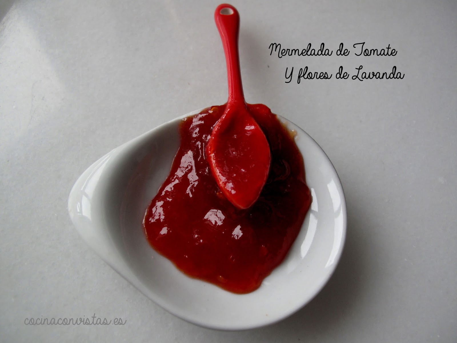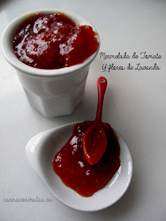 Escaldar los tomates, pelarlos, trocearlos y retirarles las semillas (hay veces que lo hago y otras no). Colocar los tomates en un bol junto con el azúcar, y el zumo de limón. Dejamos reposar  12 horas. Pasado este tiempo añadimos el clavo de olor, pasamos todo a una cazuela  y llevamos al fuego. Cocinamos a fuego suave, removiendo de vez en cuando, durante 1 hora o hasta que la mermelada adquiera la textura deseada. Cuando apagamos el fuego pero aún caliente la mermelada, retiramos el clavo e incorporamos las flores secas de lavanda. Pasamos la preparación a un tarro previamente esterilizado y guardamos en frío.