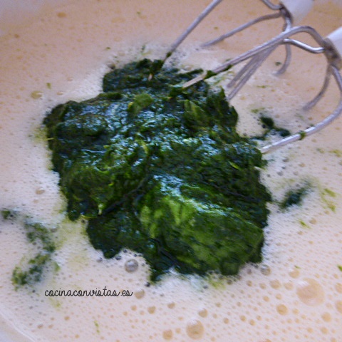 Batimos los huevos con el azúcar (mejor con las varillas eléctricas) hasta obtener una crema esponjosa. Vertemos el aceite en esta crema y batimos un poquito más.  Añadimos las espinacas, el jugo y la ralladura de limón y lo mezclamos todo bien.