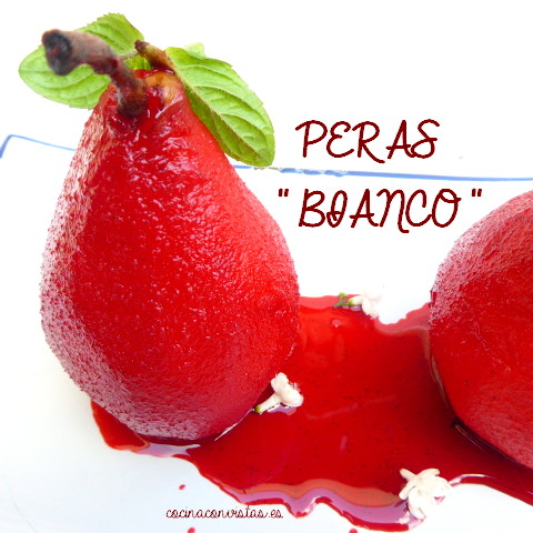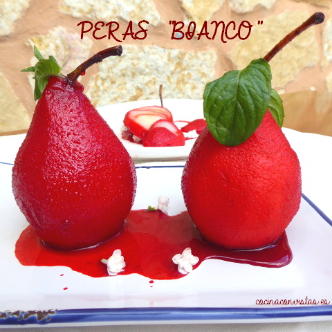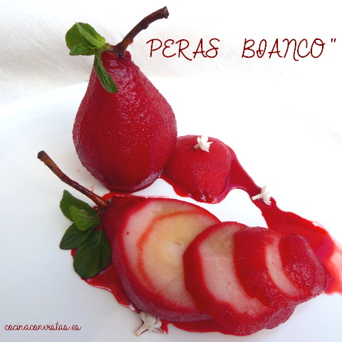 Pelamos las peras y las introducimos en una cazuela junto con el resto de los ingredientes. Mejor si la cazuela es honda y las peras quedan totalmente cubiertas (así evitamos darles la vuelta), pasados 20 minuto sacamos las peras y dejamos que el líquido siga cociendo hasta que se reduzca formando un almíbar espeso.