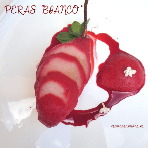 Colocamos las peras en el plato de servicio y las regamos con unas cucharadas del almíbar,
